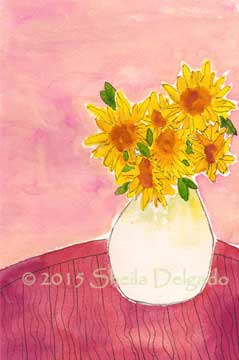 Sunflower-Bouquet ← Previous Next → Sunflowers in a white vase. 6 x 9 watercolor on 140 lb. Arches cold pressed paper. © Sheila Delgado Sunflowers in a white vase. 6 x 9 watercolor on 140 lb. Arches cold pressed paper. © Sheila Delgado