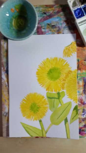sunflowers in progress, 6 x 9 watercolor. 2015 Sheila Delgado