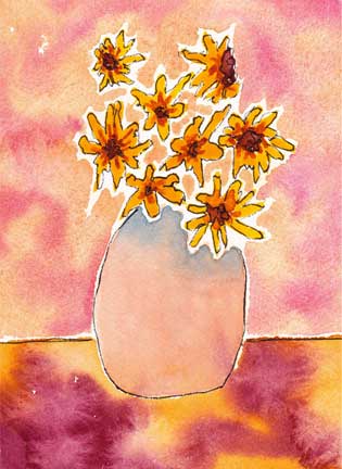 Bouquet-iin-pinks Sunflowers in a pink vase. 4.5 x 6 watercolor and ink on 140 lb. Arches cold pressed paper. © 2015 Sheila Delgado Sunflowers in a pink vase. 4.5 x 6 watercolor and ink on 140 lb. Arches cold pressed paper. © 2015 Sheila Delgado