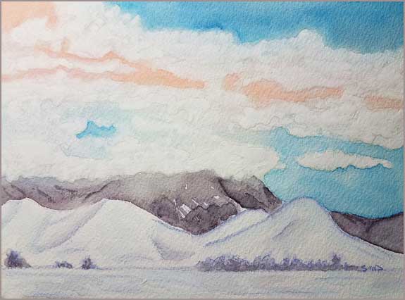 Christmas-Eve-Mountains Next → Snow On Christmas Eve. 5 x 5 in. watercolor on Arches 140 lb. cold pressed paper. © 2016 Sheila Delgado Snow On Christmas Eve. 5 x 5 in. watercolor on Arches 140 lb. cold pressed paper. © 2016 Sheila Delgado