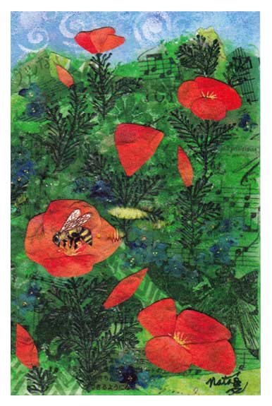 I received a spectacular side swap from my friend Natasha Monahan Papousek in the San Diego area. I scanned it to be sure you could see all the wonderful details. Just look at all that layered paint and collage fun! Love the sweet little bee! Love the swirly clouds, the blooms, the music is in the air feeling! Natasha does intricate Henna art and she is a talented photographer. We actually met in person, years ago. Thank you Natasha for sharing this terrific piece with me!