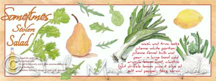 Sometimes Stolen Salad ← Previous Next → Click to see on TDAC Recipe for TDAC, salad, watercolor, pear, lemon, leeks, fennel