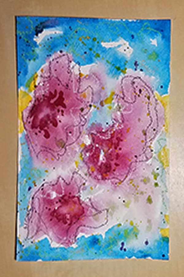 I made use of scrap paper. A couple of extra wide bookmarks. Some smaller, simple florals. I worked in several sizes. 4 x 4, 8 x 8, a couple 10×10’s. I worked with watercolor, acrylics, mixed media & digital collage.
