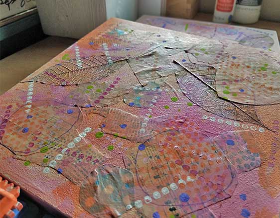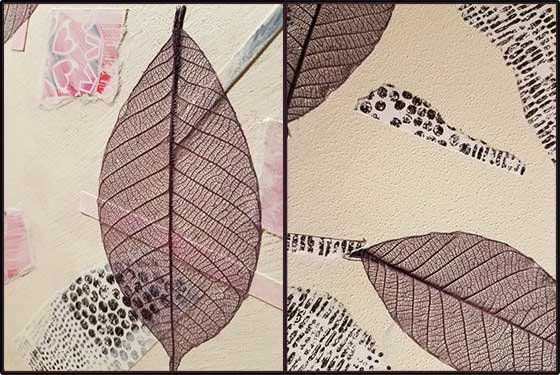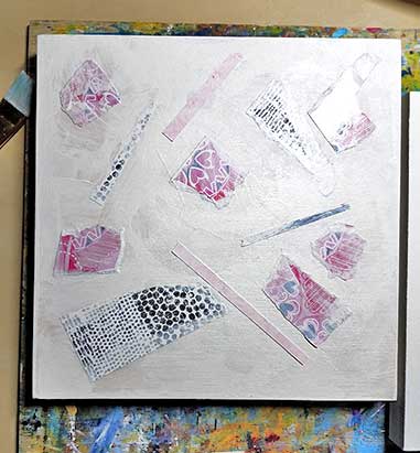 As a result, I am not creating much. I am managing to stay productive otherwise. I started two pieces about a month ago. Mixed media on panels, they will be gifts. I applied scraps of papers, part of a decorated tissue box, and some leaf skeletons I have had for over ten years.