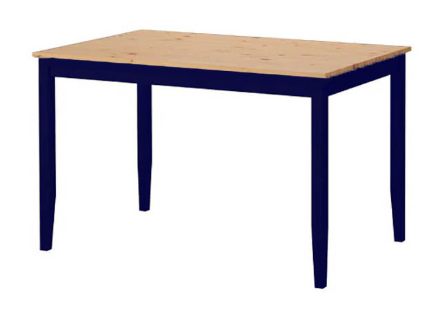 The table is from IKEA. Solid pine. The top has a clear lacquer that is “easy to clean, resistant to liquids, food stains, oil, heat, scratches, and bumps”. It is warm and, welcoming. It came with white legs. I painted them Prussian blue. But honestly, they are in shadow and look black to everyone else. Ha-ha.